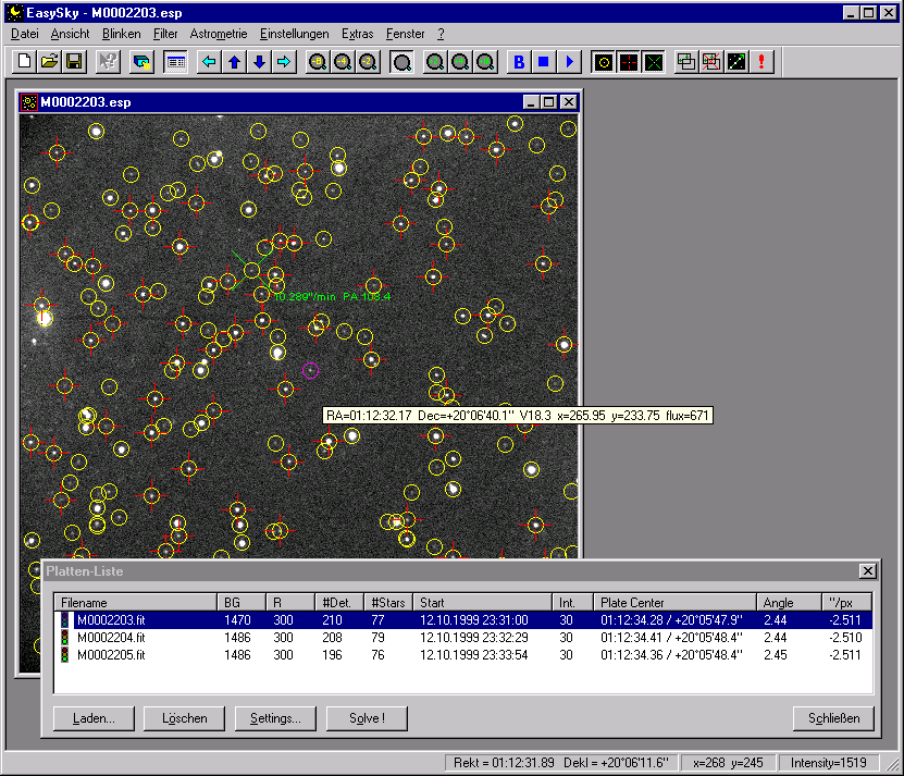 Sie können mehrere FITS-Bilder laden und diese Kombination mit allen Einstellungen als Dokument abspeichern. Auf Mausklick löst EasySky Pro die Bilder und zeigt die gefundenen Sterne/Objekte sowie die erfolgreich zugeordneten Referenzsterne an. Die Bilder können auch "geblinkt" werden, um Asteroiden oder Kometen zu erkennen. Das Suchen bewegter Objekte übernimmt ESP auf Wunsch auch automatisch.
